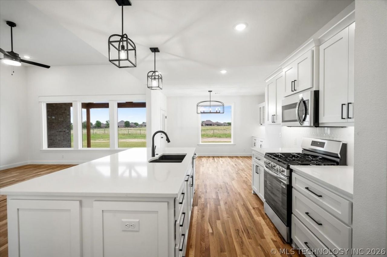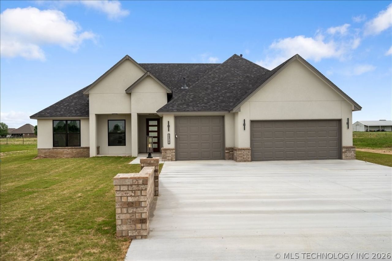 New construction home on over half an acre backing to a greenbelt in Collinsville Schools. This thoughtfully designed 3-bedroom, 2.5-bath home with dedicated office offers 2,112 square feet of functional living space with high-end finishes throughout. Real hardwood floors run through the main living areas, including the living room, kitchen, dining, office, entry, hallways, and primary bedroom, with carpet in the two secondary bedrooms. The open-concept layout features a spacious kitchen with a large island offering exterior storage, walk-in pantry, and a designated dining area with built-in cabinetry and display cabinets. Abundant natural light highlights the clean, modern design and upgraded lighting package. The primary suite includes a spa-like bathroom with oversized walk-in shower, built-in bench, and an expansive three-tier walk-in closet. Additional features include a large laundry room with extra storage closet, half bath off the kitchen, and a 3-car garage. Enjoy outdoor living on the oversized covered back patio overlooking the greenbelt. Move-In Ready by April 30, 2026.